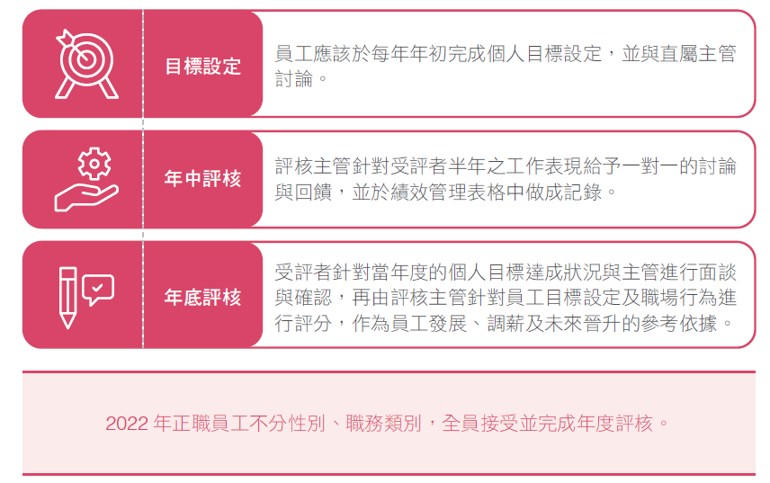 落實以績效為依歸的薪酬政策,我們定期進行全員績效評估,共分為三階段進行,年初的目標設定、年中評核與年底評核,以及透過主管與同仁的績效面談,適時指導並協助員工精進工作技能,達到有效的雙向溝通。公司並訂有道德行為準則,明確規範員工應遵循之企業倫理事項及應履行之責任義務,員工之職場行為亦列入績效評核標準,並依其行為表現給予明確之獎勵及懲處。