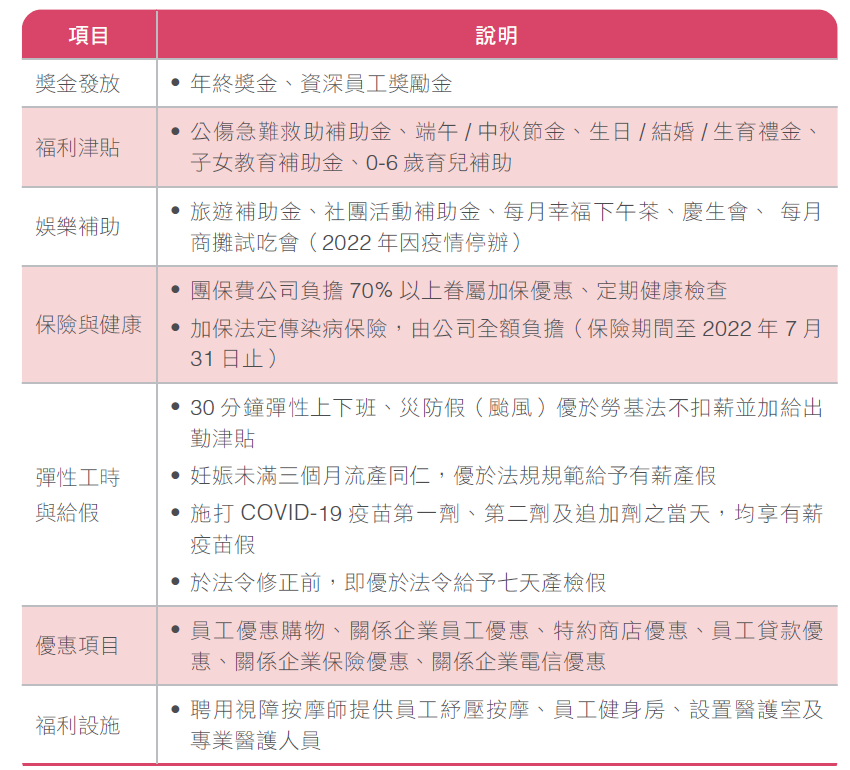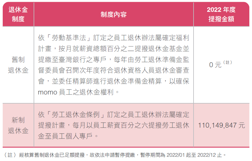 除上述福利外,為能落實員工照護,以達企業勞雇關係的永續經營,進而提升本公司員工向心力並強化優秀員工之留任,自2020年1月起,開辦員工持股信託已兩年。此制度是由資深專員及基層主管以上職級之員工,每月固定自薪資中提撥一定金額之自提金,加上公司另提撥相同金額之公提金,來鼓勵員工每月定期定額投資momo,成為momo股東一份子的同時,與公司共同分享經營成果,健全企業經營。截至2022年12月31日之在職員工,符合資格人數為1,099人,自願入會為925人,參加率達84.2%。本公司2022年度入會人數較2021年12月成長22%,顯見員工對於公司發展之信心;累積公提金支出共計2,307萬元,較2021年成長13%。