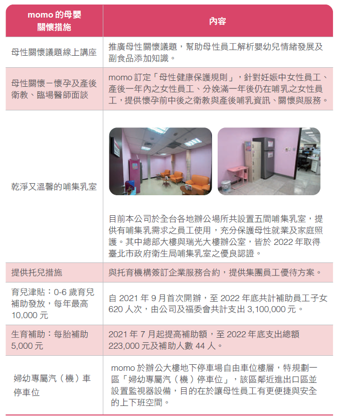 momo因產業特性女性員工超過6成,且平均年齡落在34.2歲,正值生育階段,momo規劃及採取必要之安全衛生措施,推動母嬰關懷制度,提供各階段不同需求的協助,達到母性員工健康保護、且友善孕育之目的,以下針對母嬰關懷措施進行說明: