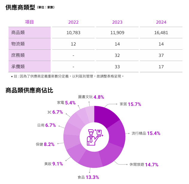 因營收持續成長及物流倉儲擴建,各類供應商亦不斷增加,截至2024年商品供應商為16,481家,囊括3C、日用、家電、家居、流行精品、美妝、保健、休閒、食品及海外自營等豐富類型。觸及之各產業皆佔比約4.8% 至15.7%,其中以家居類佔15.7% 為最高,其次流行精品、休閒旅遊、食品亦各佔10% 以上。整體產業平均成長,新供應商的加入提高商品豐富性與完整度,讓momo購物更廣泛深入消費者生活中。