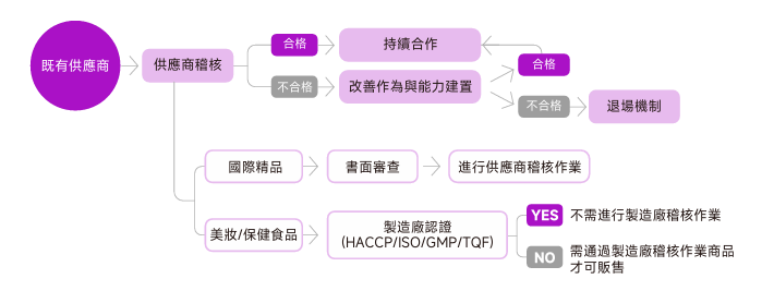 momo透過定期與供應商業務維繫,即時掌握供應商營運狀況,如發生疑似商品品質異常或違反法規之情事,將立即採預防性暫停業務銷售;另視查證後之影響範圍、情節輕重等情況,安排專人協助、輔導或終止合作。此外,對於運作活躍度較低的供應商,根據其營業規模、帳務往來條件,定期執行供應商體質健檢,進一步判斷未來繼續合作的業務發展機會。