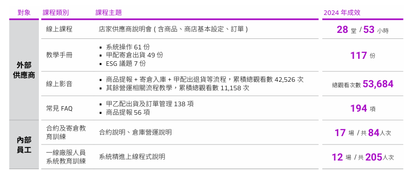 2024年momo於SCM 學堂上架14支新影片,平台年度總觀看次數逾5.3萬次,延續與去年一樣穩定的關注度;累計發行教學手冊98份、教學影片33支、常見FAQ 194題,共開立17場內部業務單位之合約與寄倉教育訓練,及12場一線廠服人員系統教育訓練。藉由整合多元線上學習資源,依據不同產業之供應鏈需求,從商品呈現、法規、廣告行銷、銷售分析、備貨寄倉、運輸配送、客戶服務以及ESG等全方位營運流程,分階段設計不同學習主題,並定期依供應商回饋更新內容,以滿足最新的需求,提升學習效率,同時精進營運管理與科技能力。momo服務對象包括企業客戶、配送商和供應商,提供多元合作模式的一站式線上服務,我們將整合供應商服務專區,推行線上簽約審核機制,打造即時、數位化的供應鏈服務平台。
