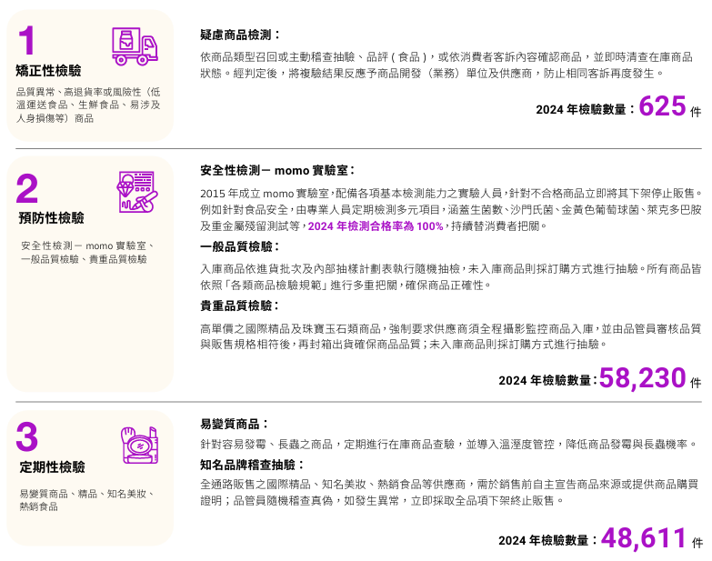 momo慎選供應商,並以合約要求所有供應商提供的商品須符合法規及標示,並設有神秘客訂購檢驗及稽核機制,以確保商品品質與安全。在商品品質把關方面,本公司設立「品質管理部」持續投入資源加強檢驗商品品質、成分、來源以及中文標示是否符合法令規範。在物流端,momo將品質管理內化為物流中心的核心,北區物流中心於2019年底導入ISO 9001品質管理系統,訂定「全員參與、持續改善、顧客滿意」的品質管理政策;以「作業管制標準化、落實矯正預防、企業永續發展」為三大指標,確保物流各階段作業間完善串聯,達到最高品質的運作。2020年momo北區物流中心成為全台第一間通過SGS「ISO 9001品質管理系統」驗證的電商營運物流中心場址,並已於2023年將退貨、運輸納入外部稽核範圍。2024年累計共374人完成線上ISO教育訓練,ISO員工覆蓋率達62%,從主管到每一位同仁落實ISO教育訓練。