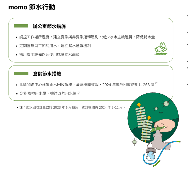 momo無製造工廠與製造程序,營運用水100%皆為民生用水,並依法令規範之放流水標準為上限,將廢水排入污水處理廠進行處理,2024年momo及合併財務報表所有子公司共用水107.41千立方公尺(107,407.33度水),資料涵蓋率為100%。經momo節水行動努力,用水密集度降至0.88度/新臺幣百萬元,較2023年減少3.70%。