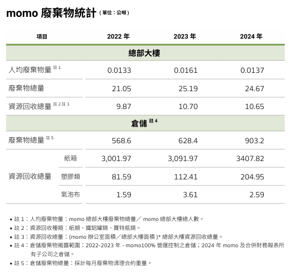 momo營運產生之廢棄物經認定皆屬一般事業廢棄物,無有害事業廢棄物產出,依法令規範妥善分類處理,委由具合格證照之廢棄物清理廠商進行清運,並交至公營焚化爐進行處理。我們訂定年度廢棄物減量目標,並持續推動減量宣導與相關措施,2024年總部大樓人均廢棄物相較2020年(基準年)下降18.25%。