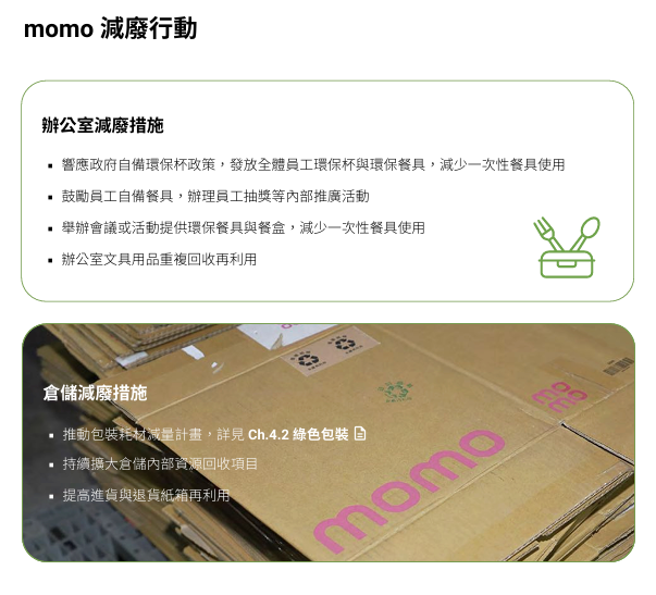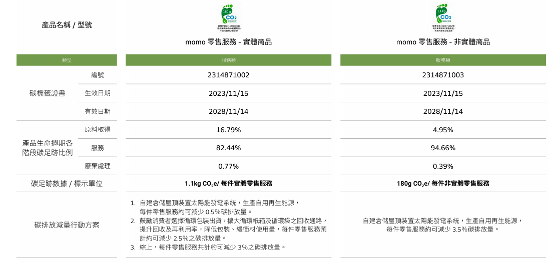 為使網購消費碳排放透明化,momo於2023年通過ISO 14067碳足跡查證並取得環境部碳足跡標籤,盤查momo零售服務(含網路、電視、型錄)生命週期各階段的碳排放量,從消費者在momo平台下訂單後,透過系統服務、撿貨包裝、運輸配送,最後交至消費者手上之服務流程,提供每件零售服務之碳排放量,讓消費者瞭解碳足跡資訊。並針對各階段碳排放熱點,規劃對應減碳措施,展現減碳決心。