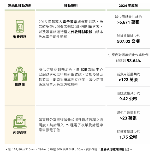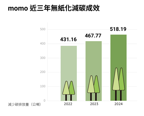 momo從「消費通路」、「供應商」和「內部簽核」三方向推動無紙化,減少紙張使用,亦提升作業效率。透過無紙化減少用紙量,2024年共減少6,818萬張以上用紙,相當於減少518.19公噸碳排放量。