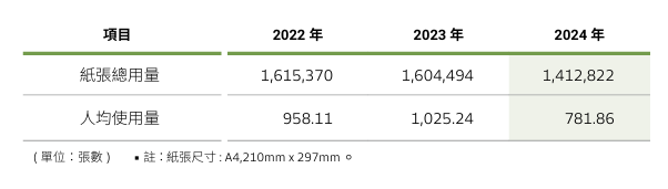 momo推動行政文件紙張減量行動,建立內部影印量管控系統、定期宣導員工紙張雙面使用,並推廣採用線上會議及電子文件辦公, 2024年較2023年約減少使用19.17萬紙張、人均紙張使用量較2020年(基準年)減少約32.38%,未來將持續開發電子化表單,減少影印紙使用與廢紙產生。