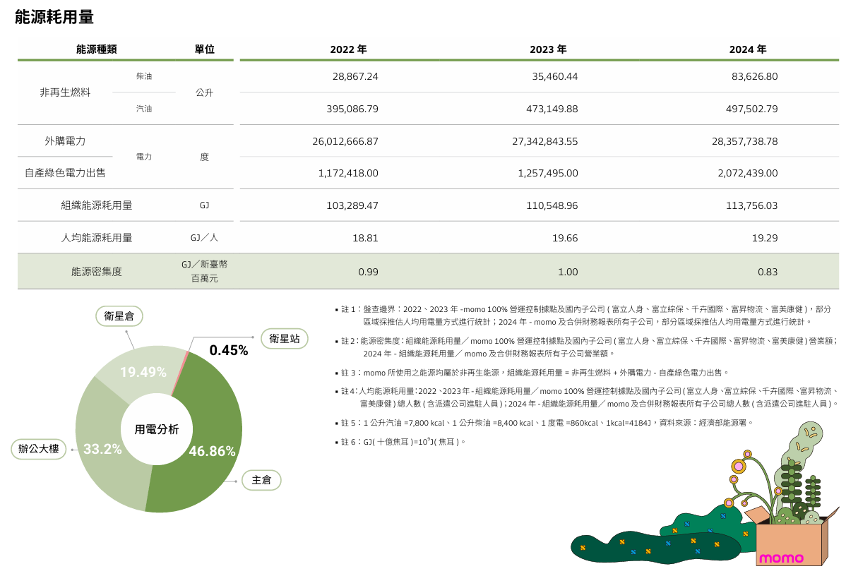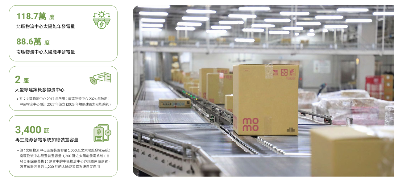 momo北區、中區與南區物流中心皆設有太陽能發電裝置,北區物流中心年產出逾120萬度綠電;南區物流中心已於2024年11月啟用,中區物流中心預計於2027年啟用,每年預計可提供各約130萬度綠電。未來momo自購/自建倉儲將全面建置再生能源系統、自發自用,提高再生能源使用量。