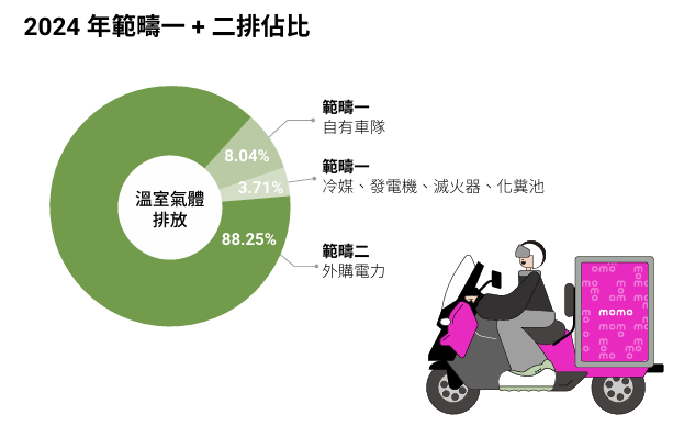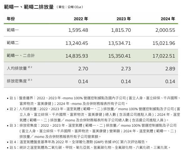 momo自2016年依據ISO 14064-1進行溫室氣體範疇一、二及範疇三盤查,維持每年通過第三方查證,資料涵蓋率已達100%。2024年溫室氣體範疇一及範疇二排放量合計17,022.51公噸CO2e、人均排放量2.89公噸CO2e/人、排放密集度0.14公噸CO2e/新台幣百萬元。