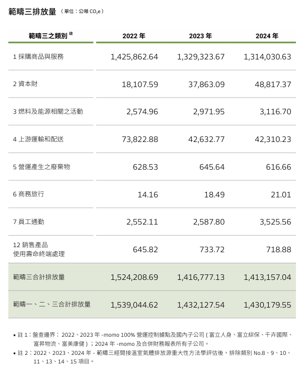 2024年範疇一及範疇二排放量、人均排放量較2023年微幅增加,係因自有配送車隊配送量成長及南區物流中心啟用。為持續落實減碳行動,以2050淨零碳排為目標,透過「綠色營運」、「綠色包裝」、「綠色物流」三大面向積極推動減碳,相關措施請詳2024永續報告書對應章節內容。