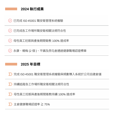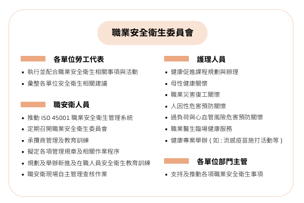 委員包含職業安全衛生人員、各部門主管、護理師以及勞工代表;委員共24人,勞工代表占42%。每季皆召開會議,2024年共 4場,主要針對職安衛系統架構建立、各工作場所員工職安衛執行及健康管理事項議題,討論決策之議案經呈報高階主管核准後,由委員會負責推動與執行。2024年會議報告事項共通過23項勞安單位執行事項報告議題、19項職安衛與健康管理議題。