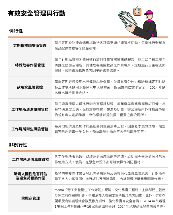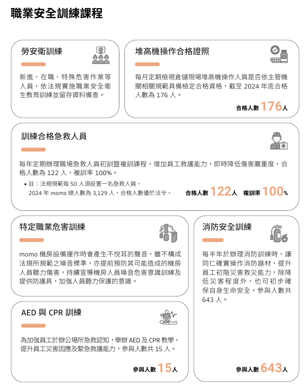 momo致力於提供安全健康工作場所,於2019年導入ISO 45001 職業安全衛生管理系統,涵蓋公司全部場所,以系統化機制落實員工安全衛生管理。針對高風險作業,執行倉儲配送作業危害辨識與風險評估,並採取作業許可等管制措施,強化作業風險管控,有效防範任何職業災害的發生,迄今內部稽核與外部驗證範圍涵蓋總部大樓及北區物流中心所有員工含派遣人員,共2,330人,佔總人數60.1%;其他非員工共20人,比例約0.5% (駐點人員) (註),未來將驗證範圍擴大至公司自建倉儲,提供全面照護並建立職場安全的決心。