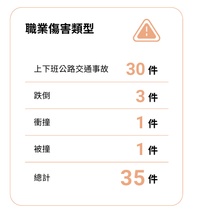 2024年總計35件員工職業災害事故(非員工職業災害事故為0件),主要類型以上下班公路交通事故為主;截至2024年底共34位同仁回到工作崗位,復工率97%。