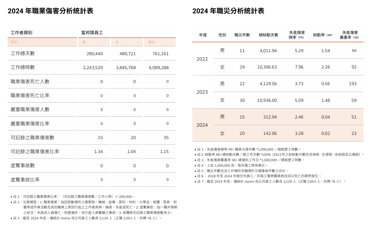 統計2024年員工職業災害申請類型,包含所有員工及非員工但其工作或工作場所為momo管控之對象(承攬商),並統計工作場所及上下班交通事故。職業災害事故發生時,momo除立即採取必要之急救、搶救等措施,並針對該事故之發生原因及處理流程展開調查,由災害發生單位主管依「重大事件通報管理辦法」,重大事件之後續處理結果及檢討。另若為涉及死亡或失能之重大事件,其後續處理結果及檢討,得由總經理指派專人進行追蹤作業,或執行教育訓練及宣導以能有效防止事故再發生 時將損失降至最低。
