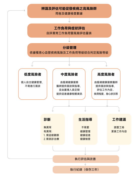 為守護同仁職場健康,momo定期運用問卷及健康檢查數據,辨識及評估可能促發疾病之同仁,並依據罹患心血管疾病風險、工作負荷量等因子,綜合判定高中低三個風險等級,並針對各風險等級給予對應改善措施及生活指導。