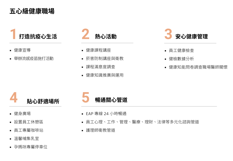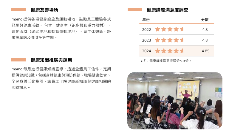 為提升員工健康識能、建立健康生活型態與疾病預防,規劃「健康促進活動課程」、「自主健康管理減重活動」及「心理調適課程」,並推動「健康友善場所」,讓員工有不同的方式管道能獲得健康知識與行為改變,提升健康與有益健康的行為。為照護每位員工個人健康,momo建立完善的員工健康管理制度,對於妊娠中員工進行母性關懷並持續提供哺乳衛教等協助, 2024年完成100%妊娠與產後期間衛教。