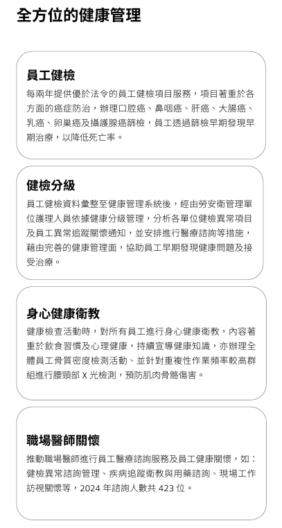 提升企業員工健康活力,與各地區健康中心合作及自主辦理相關健康課程與講座共31堂、836人次參加,包含「自我筋膜放鬆伸展趣」、「預防慢性病」、「遠離菸酒檳 健康跟著來」、「急救與救護知識」與「身心靈紓壓」等類型供員工自由選擇參與, 2024年健康講座平均滿意度4.85分(滿分5.0分)。