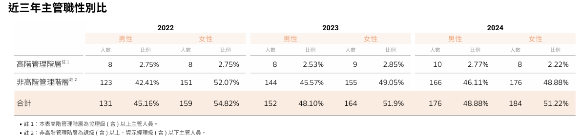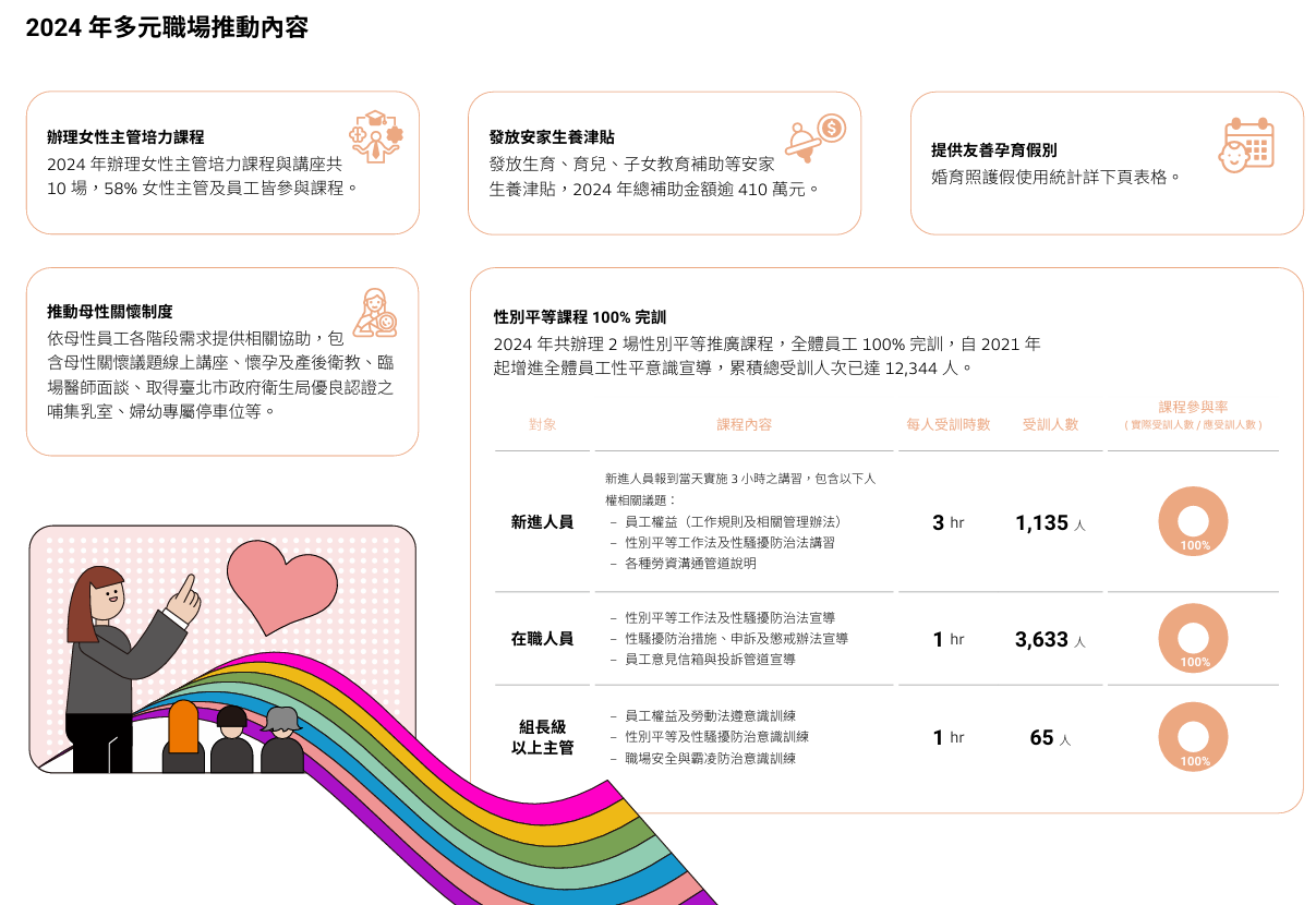 為加強本公司性別平等、多元性別之意識建立,momo於2021年成立「性別平等推廣委員會」,由各高階主管擔任當然委員推動各項措施。透過落實「女性賦權」、「性別平等推廣」、「友善職場與照護」三項策略構面,積極創造友善的工作場域,使同仁皆能在多元包容的職場環境中工作。我們持續聚焦企業永續最關鍵的核心「人才永續」,並積極倡議女性培力政策,每年辦理女性培力課程,採用循序漸進方式引導學習,透過小組討論、互動分享等,提升女性主管核心管理及領導培育決策能力。此外,亦對於全體員工辦理性別平等相關課程和講座,並特別針對主管實施法遵意識課程。 momo持續營造開放多元且包容的工作環境,近三年女性員工擔任主管職人數皆略高於男性。 momo重視性別平等議題,持續推動促進性別平等之教育訓練,以及員工工作與家庭平衡、友善孕育等相關措施。曾於2022年獲得臺北市職場性別平等認證「金質獎」肯定,並於2024年再次榮獲金質獎,讓我們更有信心推動相關措施,並將多元共融的價值觀推廣到更廣泛的社會層面。