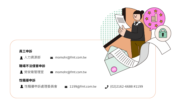 momo積極暢通內部申訴管道,設置專線電話、傳真、專用信箱或電子信箱,揭露於官網利害關係人專區,可透過各式管道及時反映,促使公司及時處理,所有申訴案件皆可在安全及保密情況下傳達意見。當收到申訴後將於一週內進行初次訪談,並彙整資料呈報經營層主管,後由專責單位進行調查,並於必要時成立專案小組,直接向總經理呈報,經核示後完成後續具體處理方案並追蹤相關單位處置情況。2024年共接獲32件員工申訴(含性騷擾申訴),已全數進行了解並積極處理,後續不再有申訴之情形。