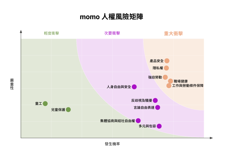 momo鑑別出的前五大人權風險為:「產品安全」、「隱私權」、「強迫勞動」、「職場健康」、「勞動條件保障」。詳細風險分布請見下圖: