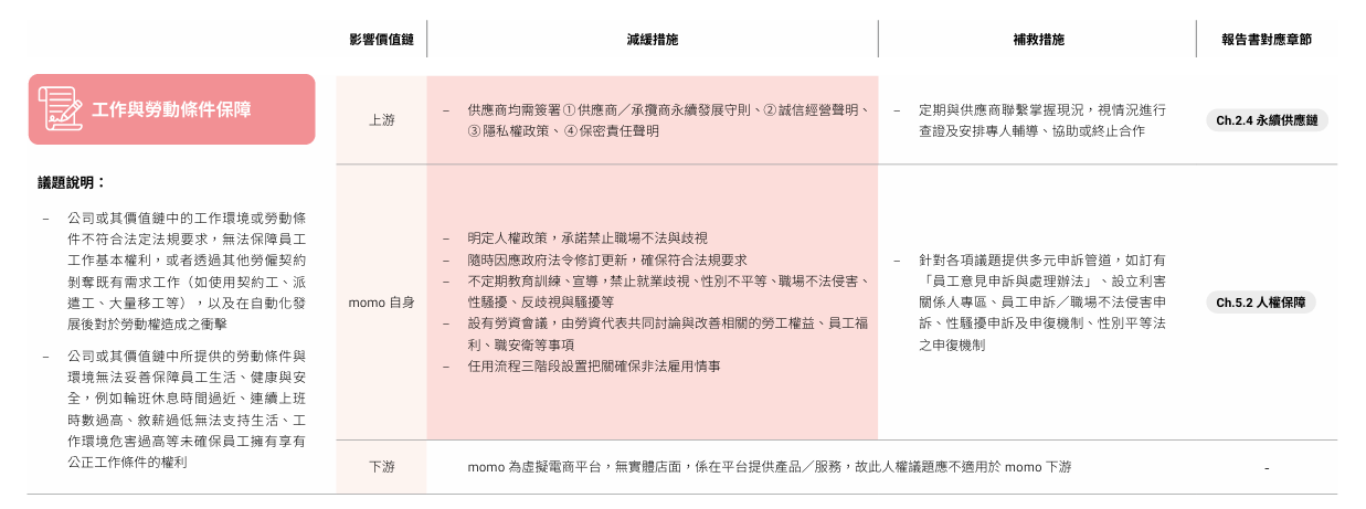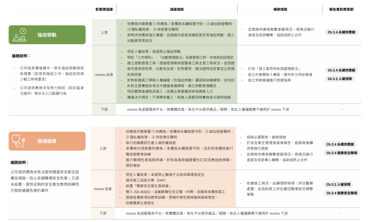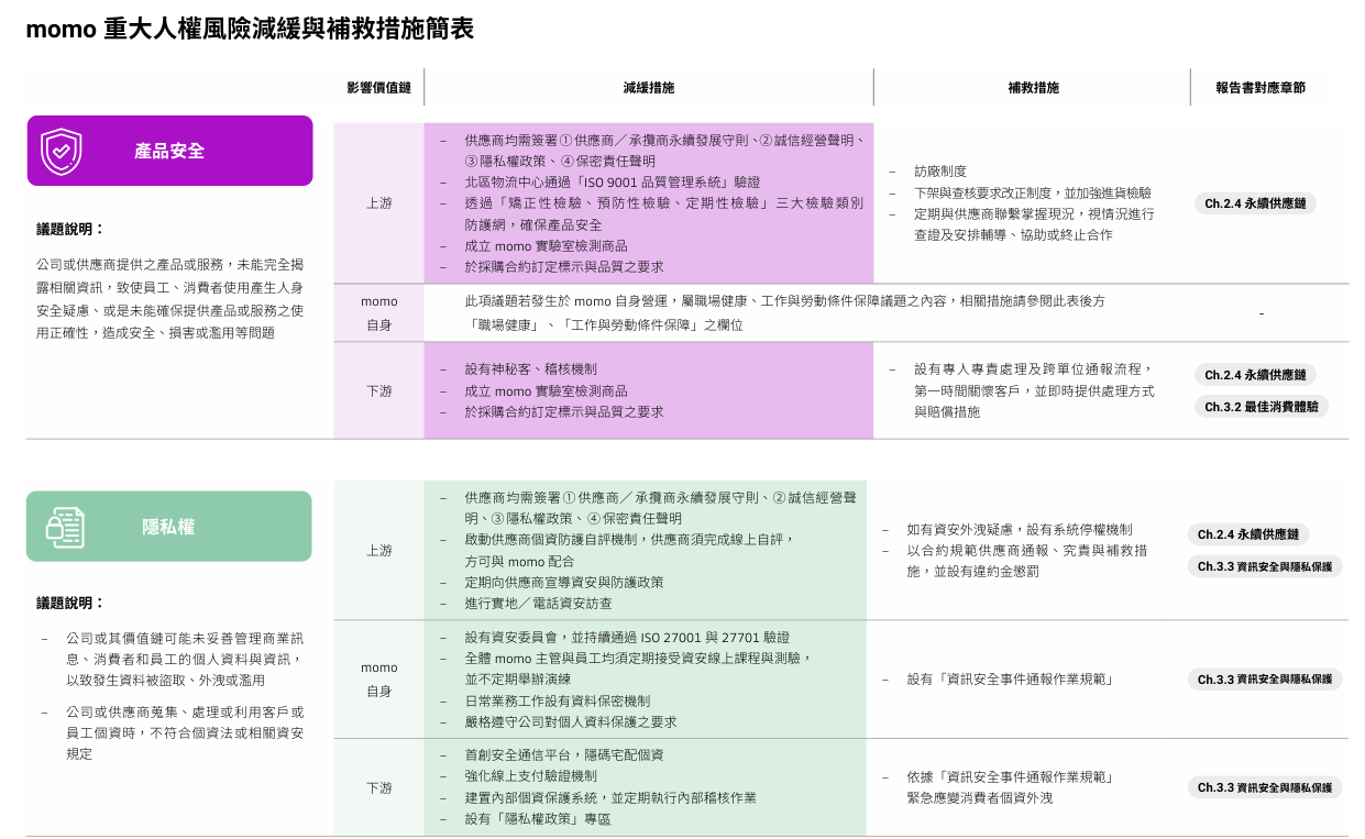 momo於2022年率台灣電商業之先啟動人權盡職調查,召集本公司相關單位主管,以及日常工作業務中與價值鏈夥伴(商品/物流/庶務供應商、承攬商、消費者)主要接觸之單位同仁,透過工作坊與問卷調查,逐一檢視公司營運和整體價值鏈中可能發生的人權議題,產出風險矩陣,鑑別出前五大人權風險議題,並針對鑑別出之重大人權議題盤點相關減緩與補救措施,掌握人權管理現況。