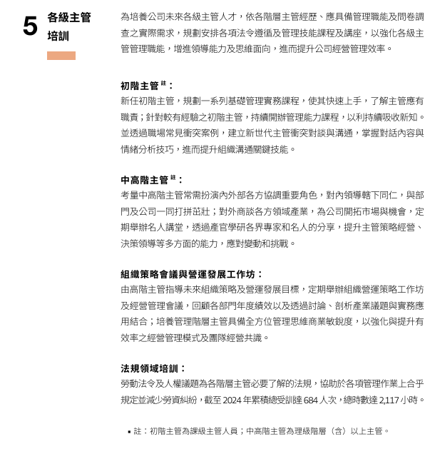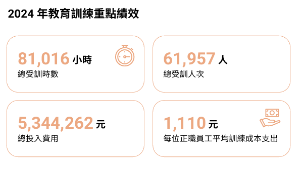 為深化企業永續育才文化,2023年啟動企業內訓的數位轉型,導入「訓練學習系統平台(HRD)」,打造更完善的教育訓練規劃和學習環境,實現混合學習的加乘效果,目前全體員工100%皆已參與線上學習。2024年度課級(含)以上主管之員工教育訓練總時數為13,645小時,平均訓練時數為33.69小時。