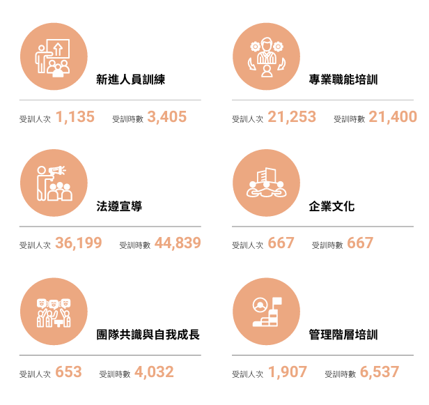 momo訓練架構分為六大類,分別為新進人員訓練、專業職能培訓、法遵宣導、企業文化、團隊共識與自我成長及管理階層培訓,每年依照訓練藍圖以系統化方式規劃,循序漸進各職務類別訓練,並確保訓練品質及學習落實,於課前了解需求、規劃,課後追蹤落實,後續針對課程持續改善精進。