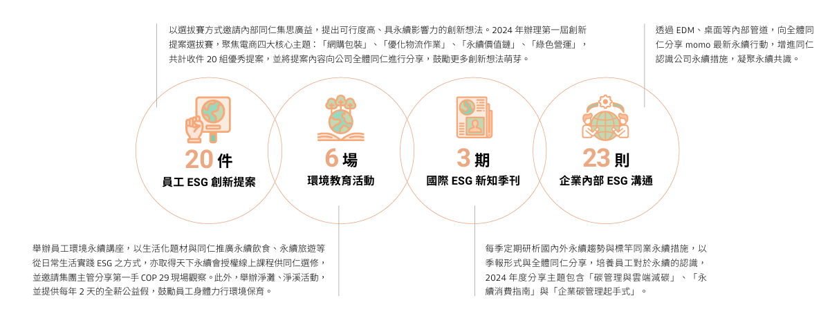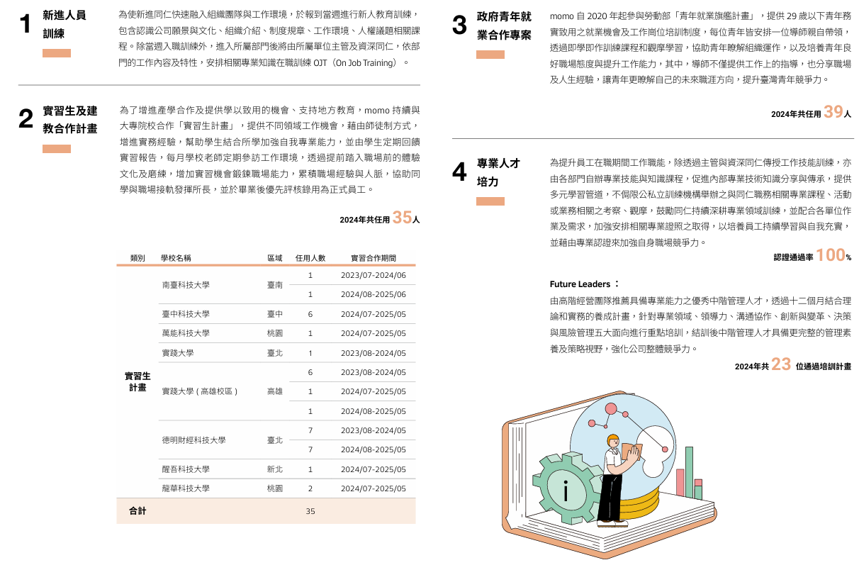 momo持續響應天下雜誌「TALENT, in Taiwan 臺灣人才永續行動聯盟」倡議,建構多元包容職場,並透過打造完整的教育訓練體系,強化人才競爭力,與全體員工共創精彩職涯。