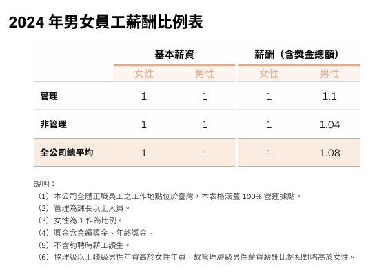 為提升內部薪資競爭力,以吸引及留任優秀人才、穩定員工生活品質及基層人員薪資待遇,2024年新進電話行銷業務人員起薪符合法定基本工資,其他正職基層人員無論女性或男性之起薪,均高於法定基本工資1.13倍,正職基層人員之薪資水平不因性別而有差異。此外,momo依循證券交易所修訂之辦法,揭露非擔任主管職務之全時員工薪資平均數,以行動力展現momo對於員工之重視。