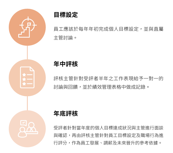 落實以績效為依歸的薪酬政策,我們定期進行全員績效評估,共分為三階段進行,年初的目標設定、年中評核與年底評核,以及透過主管與同仁的績效面談,適時指導並協助員工精進工作技能,達到有效的雙向溝通。公司並訂有道德行為準則,明確規範員工應遵循之企業倫理事項及應履行之責任義務,員工之職場行為亦列入績效評核標準,並依其行為表現給予明確之獎勵及懲處。2024年除試用期以外之正職員工不分性別、職務類別,全員接受並完成年度評核。