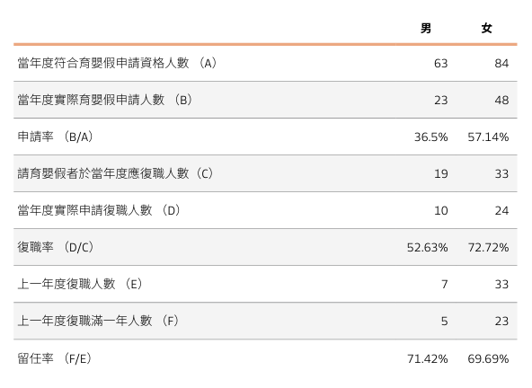 momo配合政府推動育嬰留職停薪制度,讓員工能夠更彈性地運用於育嬰及照護子女,並保障期滿復職員工恢復原職。若員工因家庭照顧需要,提出轉調需求,則主動協助員工復職後轉任至適當職缺,以協助員工能兼顧家庭與工作。