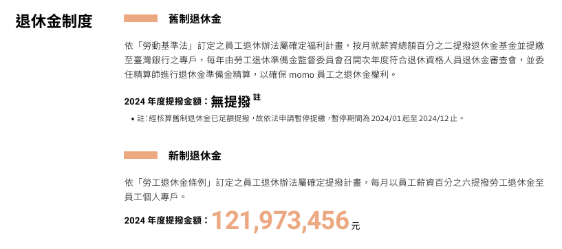 2024年非擔任主管職務之全時員工共2,756人,年薪資平均數為88萬元,年中位數為75.3萬元,與2023年相比,全時員工人數成長0.3%。年薪資平均成長3.3%、年薪中位數成長2.2%。另外, 2024年組織中薪酬最高個人之年度總薪酬與組織其他員工(不包括該薪酬最高個人)年度總薪酬之中位數的比率為13.43:1;組織中薪酬最高個人年度總薪酬增加之百分比與組織其他員工(不包括該薪酬最高個人) 平均年度總薪酬增加百分比之中位數的比率為6.38:1。(以上兩者計算方式皆不含約聘人員與任職未滿六個月之員工。)其他的momo 非員工工作者之派遣人員,於設定聘僱條件時,薪資最低門檻皆高於基本工資。