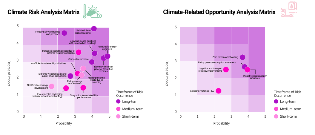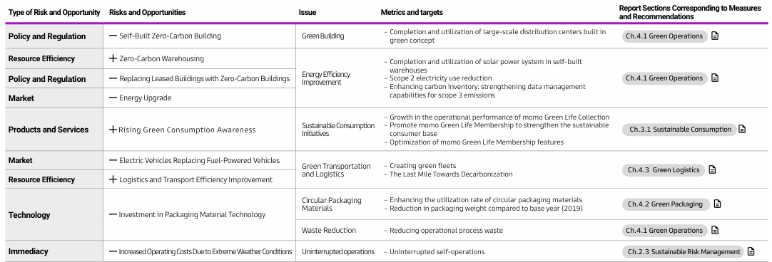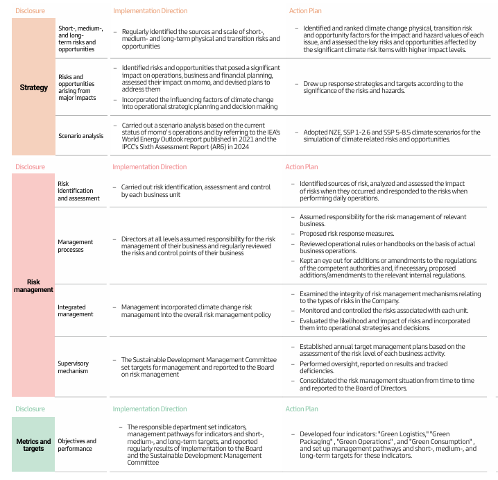To comprehensively understand the impact of climate change on the company, momo, in 2024, followed the Task Force on Climate-related Financial Disclosures (TCFD) framework issued by the Financial Stability Board. The company re-identified potential climate risks and opportunities within the retail value chain. Referring to reports regularly published by the International Energy Agency (IEA) and the Intergovernmental Panel on Climate Change (IPCC), three climate scenarios were selected for simulation analysis of climate-related risks and opportunities : the 2050 Net Zero Emissions (NZE) scenario, SSP 1-2.6, and SSP 5-8.5. The analysis identified possible impacts of climate change on company operations, related risks, and opportunities. After assessing and determining these risks, the company resolved on corresponding response measures and management approaches. To effectively grasp the climate risks and opportunities in the retail industry, momo initiates an identification process every two years. In the third quarter of 2025, the second bilingual (Chinese-English) "Task Force on Climate-related Financial Disclosures (TCFD)" report will be publicly released. The report includes detailed explanations of various indicators and targets, as well as assessments of financial impacts. Please refer to the momo 2024 TCFD report for comprehensive information.