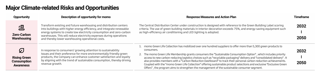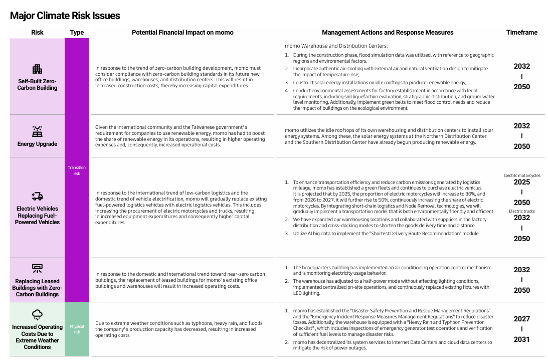 momo has identified a total of 14 climate risks, comprising 9 transition risks and 5 physical risks, as well as 5 opportunities. In the materiality ranking of climate change risk issues, the top four issues are all transition risks, including : "Self-built Zero carbon buildings" , "Renewable energy upgrades" , "Electric vehicles in place of fossil-fuel vehicles", and "Replacing leased buildings with Zero carbon buildings" . Since momo has identified the impact of extreme climate conditions on company operations as a major operational risk, it has also included the physical risk issue "Increased operating costs due to extreme weather conditions" along with up to four major transition risk issues as significant climate risks. This approach enables the identification of impacts and the detailed formulation of response measures and action plans. Additionally, the climate opportunity issues identified by momo, based on the materiality ranking results, include "Zero carbon Warehousing". In response to the consumer trend favoring green products, "Rising green consumption awareness" has also been incorporated as a significant climate opportunity. momo has further identified the impacts related to significant climate risks and opportunities, and has developed detailed response measures and action plans, continuously advancing towards the goal of transforming into a green e-commerce platform.