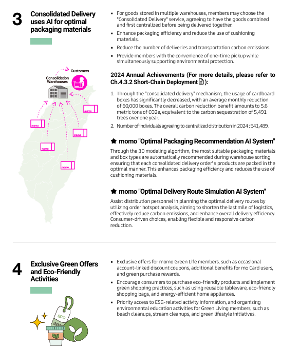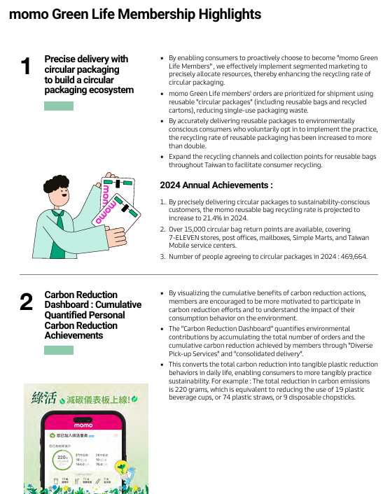 This includes priority access to delivery using "circular package", offering members a new low-carbon logistics choice through "consolidated product delivery", and accumulating individual carbon reduction achievements via a "carbon reduction dashboard". Concurrently, the program features "momo Green Life Collection" with sustainably selected products and provides "exclusive Green offers", thereby strengthening the management of the sustainable consumer segment. The momo Green Life Membership takes a multi-pronged approach to reducing environmental impact throughout the consumer journey from product selection and packaging to delivery. It enables customers to enjoy the convenience of online shopping while making more sustainable choices with ease. By the end of 2024, nearly 700,000 people had responded, joining hands to embark on a low-carbon consumption journey.