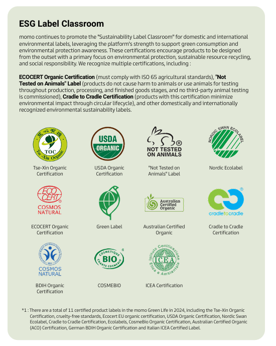 momo is committed to building a sustainable online shopping ecosystem and fostering a new culture of green consumption. In September 2023, the "momo Green Life Members" program was launched, granting consumers the "Sustainable Consumption Options".