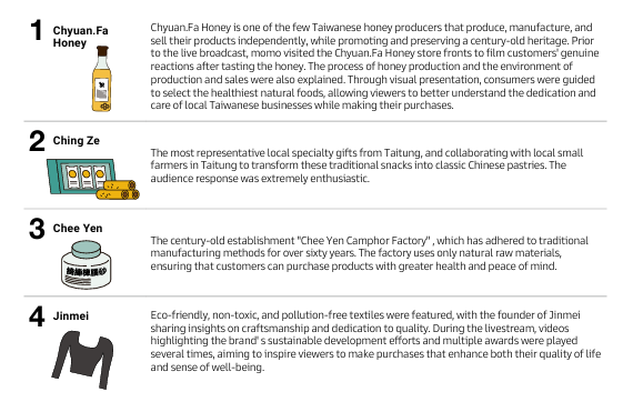 momo actively incorporates locally produced Taiwanese goods into its television shopping sales items, promoting local production and marketing. Additionally, momo has observed that in recent years, Taiwanese consumers, when considering lifestyle and product choices, not only take price into account but also show a particular preference for products featuring distinctive local Taiwanese characteristics. Therefore, in 2024, we are committed to deeply cultivating local specialty products, utilizing the power of videos to rally consumers to respond and support the purchase of local products.