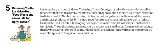 - In November, the Miaoli County Government collaborated with the Taichung Branch of the Rural Water Conservation Agency under the Executive Yuan and young farmers to introduce local products, approximately eight items.