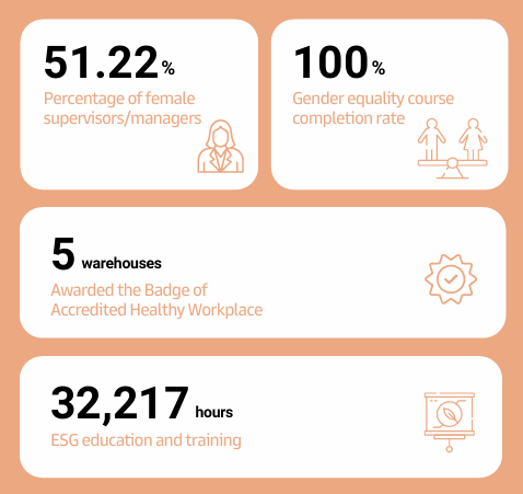 - Promote a diverse and friendly workplace and implement occupational safety and health management through the Gender Equality Promotion Committee and the Occupational Safety and Health Committee, report the achievement of related targets to the Sustainable Development Management Committee, and convene at least two executive meetings each year to track the implementation status of aforesaid matters.
