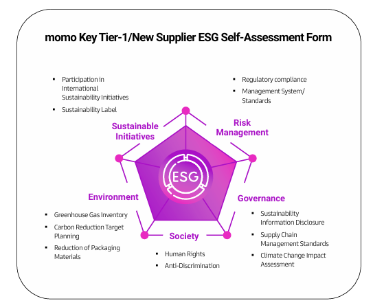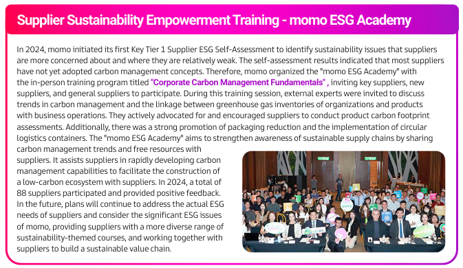 To strengthen sustainable supply chain management, external consultants were engaged to conduct interviews with relevant departments one by one, to review supply chain management processes and documentation, and to develop improvement measures. Simultaneously confirm the definition of "Key Tier-1 Suppliers" , and plan a "Supplier ESG Self-Assessment Form" specifically for key tier-1 and new suppliers. Initiate the supplier self- assessment in the first quarter of 2024, enabling momo to allocate corresponding resources based on the suppliers' current ESG implementation status, in order to formulate concrete measures for the supply chain development plan. A self-assessment questionnaire was distributed to 100 key suppliers and 62 new suppliers. Through the communication and identification results of the self-assessment, an overview of the sustainability status of suppliers and new suppliers contributing significantly to carbon emissions was obtained, including greenhouse gas management and human rights management. This serves as a basis for formulating the content of the 2024 supplier sustainability training program. In future years, momo will continue to conduct an annual key Tier 1 supplier ESG self- assessment, as well as ESG self-assessments for new suppliers, to continuously monitor the current status of suppliers and achieve a sustainable supply chain.