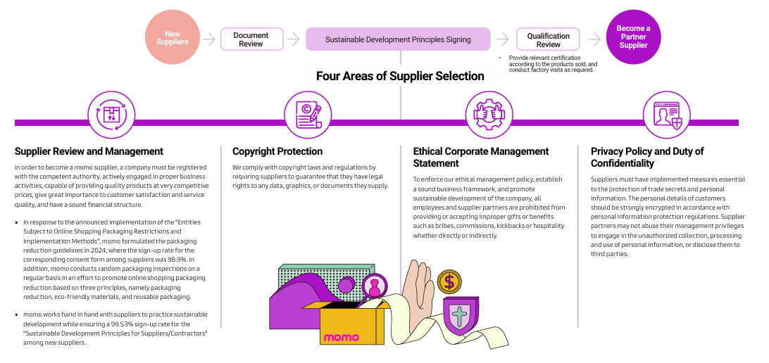 momo provides consumers with diverse, high-quality, and cost-effective products and services that are also environmentally friendly and socially responsible through collaboration with our supplier partners. We are firmly committed to maintaining a rigorous supplier selection process. In addition to requiring suppliers to provide high-quality products and after-sales service, momo also provides professional mentoring, consulting, and open channels of communication on each operational aspect so as to build a positively reenforcing sustainable supply chain.