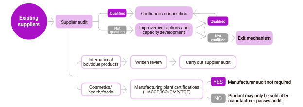 momo is committed to protecting our brand reputation and putting an end to the sale of international counterfeit boutique products. Before products can be sold, a written review is conducted in Phase One to examine information such as the supplier' s profile, sales platform, and market rating. An on-site quality management inspection is conducted in Phase Two to assess sourcing, warehouse management, operating status, and other items. For cosmetics and health food products, manufacturer certification must be examined first to decide whether a manufacturer audit is required. The audit process includes checking the environment, production process, as well as the quality controls for raw materials and products. Domestic food and cosmetics factories must hold either a GMP, TQF, cGMP, ISO 22716, HAACP, ISO 22000 or ISO 9001 certification to ensure that their products comply with government regulations and satisfy momo' s management requirements during manufacturing. An on-site inspection must be conducted for non-compliant factories to verify the documentation for production processes from stock-in to end product, production and inspection equipment, environmental hygiene and waste management, and protective measures for production personnel. This is to ensure full compliance with regulations governing food and cosmetics factories. Audits must be conducted every three years or when their certification has expired. momo enforces strict safeguards on product quality and safety. Products may only be sold once we confirm that the factory is compliant or satisfies the relevant government regulations. As of 2024, a total of 775 suppliers have passed certification or audit factory visits; among the 84 suppliers inspected in 2024, 3 were found non-compliant. Non-compliant suppliers are prohibited from listing and selling products.