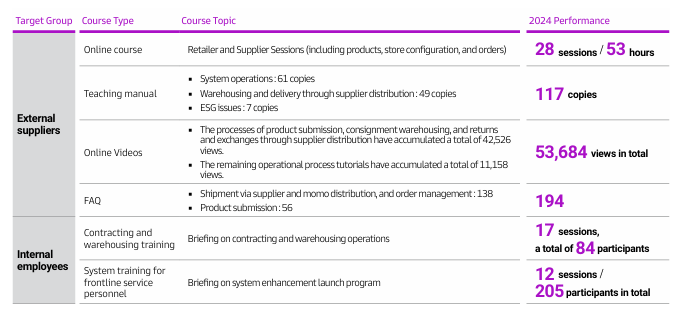 In 2024, momo uploaded 14 new videos on the SCM Academy platform, with the platform's total annual views exceeding 53,000, maintaining a stable level of attention consistent with the previous year. A total of 98 teaching manuals, 33 teaching videos, and 194 frequently asked questions were published. Additionally, 17 internal business unit contract and warehousing training sessions were conducted, along with 12 system training for frontline service personnel sessions. By integrating diverse online learning resources and based on the supply chain needs of different industries, comprehensive operational processes are addressed, including product presentation, regulations, advertising and marketing, sales analysis, inventory stocking and warehousing, transportation and distribution, customer service, and ESG. Different learning themes are designed in phases, with content regularly updated according to supplier feedback to meet the latest demands, enhance learning efficiency, and simultaneously improve operations management and technological capabilities. The service targets of momo include corporate clients, distributors, and suppliers, providing a one-stop online service with diverse cooperation models. We will integrate the supplier service area and implement an online contract review mechanism to create a real-time, digital supply chain service platform.