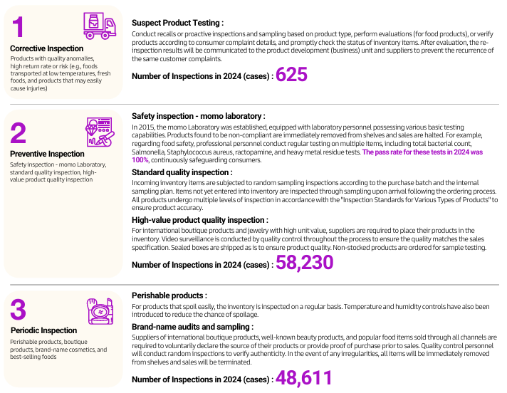 One of momo' s primary operational priorities is its commitment to product quality for consumers. We implement a three-tier inspection safeguard system comprising corrective inspections, preventive inspections, and periodic inspections. Through this rigorous review and verification process, we ensure that products comply with regulations and labeling requirements, thereby providing consumers with consistent product quality and a reliable shopping experience. 107,466 inspections were conducted in 2024 across three main categories : corrective inspections, preventive inspections, and regular inspections.