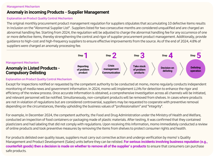 Regarding products that have already been purchased and shelved but do not comply with regulations, momo immediately activated a quality control mechanism to strengthen the inspection of supplier purchases. In 2024, an AI-assisted detection system will be introduced to rapidly analyze and interpret large volumes of textual information during product compliance reviews. This system will handle documents from various regulations, standards, and requirements, thereby improving inspection efficiency and accuracy. Based on this, a comprehensive inspection of the products was conducted, and abnormal items were removed from the shelves to prevent them from being shipped to consumers, thereby avoiding the recurrence of similar customer complaints.