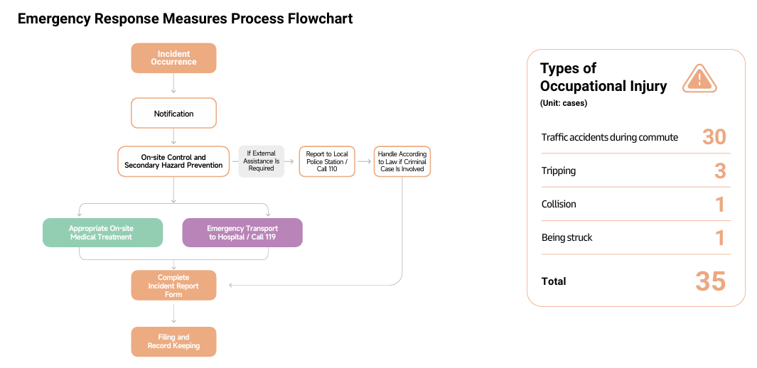 In 2024, there were 35 occupational accidents (along with 0 occupational accident among non-employees), mainly involving road traffic accidents on and off duty. As of the end of 2024, 34 employees returned to work, representing a 97% return-to-work rate.
