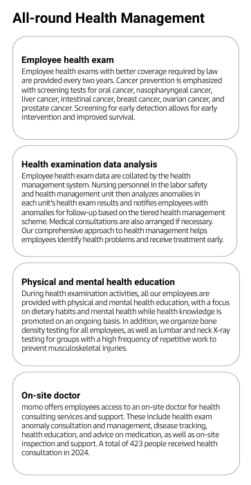 To enhance employees' health literacy, establish healthy lifestyles, and promote disease prevention, we have developed programs including "Health Promotion Activity Courses" , "Self-Managed Weight Reduction Programs", and "Psychological Adjustment Workshops" . Additionally, we promote the creation of "Health-Friendly Workplaces" to provide employees with diverse channels to access health knowledge and encourage positive behavioral changes, thereby improving overall health and wellness. To look after the personal health of every employee, momo established a comprehensive employee health management system that provides maternity care to pregnant employees as well as health education, breast-feeding information, and other types of assistance. In 2024, momo completed 100% of pregnancy and post-natal health education.