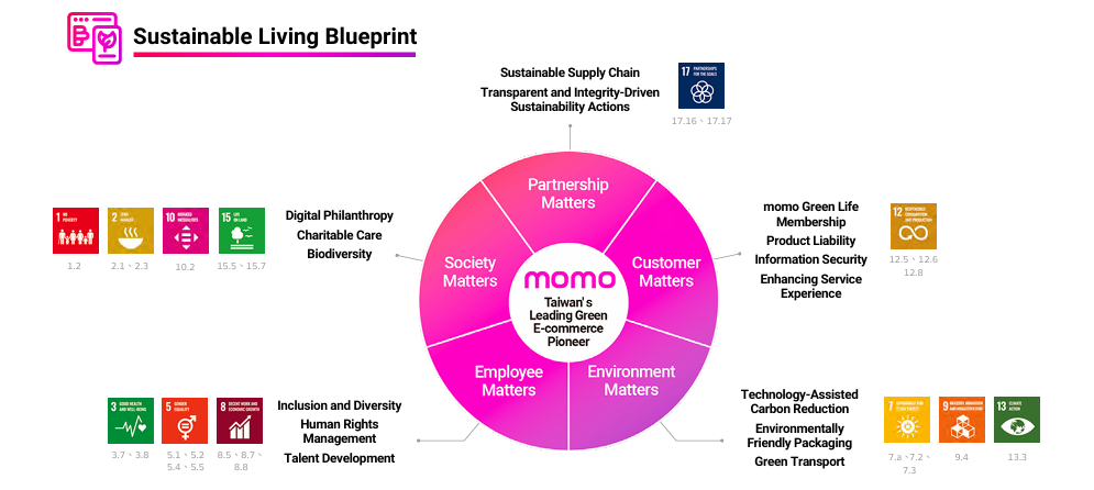 momo formally launched the sustainability vision program in 2019, outlining a "Sustainable Living Blueprint" to promote the Company's sustainable development Aligned with the five sustainability pillars of "Partnership matters", "Customer matters","Environment matters", "Employee matters", and "Society matters", momo is committed to its promise as the " Taiwan' s Leading Green E-commerce Pioneer". Through a multifaceted approach that integrates digital empowerment into its core operations and the simultaneous adoption of technological innovations, momo actively accelerates low-carbon transformation and advances digital philanthropy, continuously creating shared value for stakeholders while amplifying the positive impact of its e-commerce platform. Simultaneously, momo continues to promote the "momo Green Life Membership" program and expand the "Circular Packaging Ecosystem" ,strengthening its ESG-driven green circular economy while engaging suppliers to jointly implement sustainable and environmentally friendly operations.